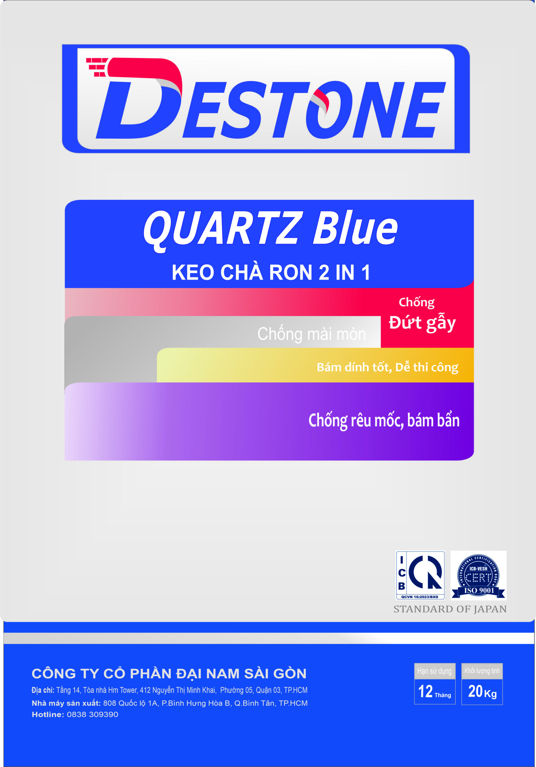 Keo chà ron 2 in 1 QUARTZ Blue DESTONE là loại bột cao cấp dùng cho ron từ 1mm đến 6mm, được sản xuất phù hợp với tiêu chuẩn VN,