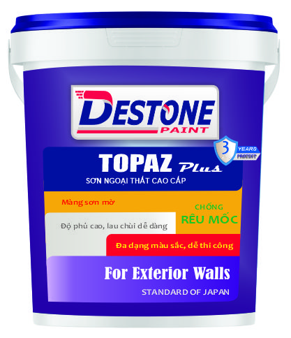 TOPAZ Plus- SƠN NƯỚC SIÊU MỊN NGOẠI THẤT : Là sơn trang trí ngoại thất với thành phần polymer acrylic gốc nước biến tính được tối ưu hoá để giúp màng sơn bám dính chắc chắN vào tường, ngăn ngừa bong tróc hiệu quả và cho màu sơn đẹp lâu hơn với bề mặt láng mịn.